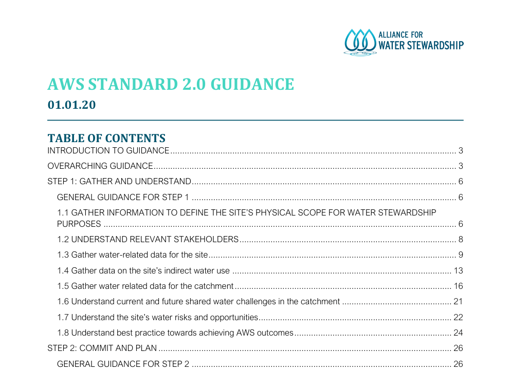 The Alliance for Water Stewardship provides the AWS International Water Stewardship Standard for major water users to understand their water use and its impacts, work collaboratively and transparently for sustainable water management within a catchment context.